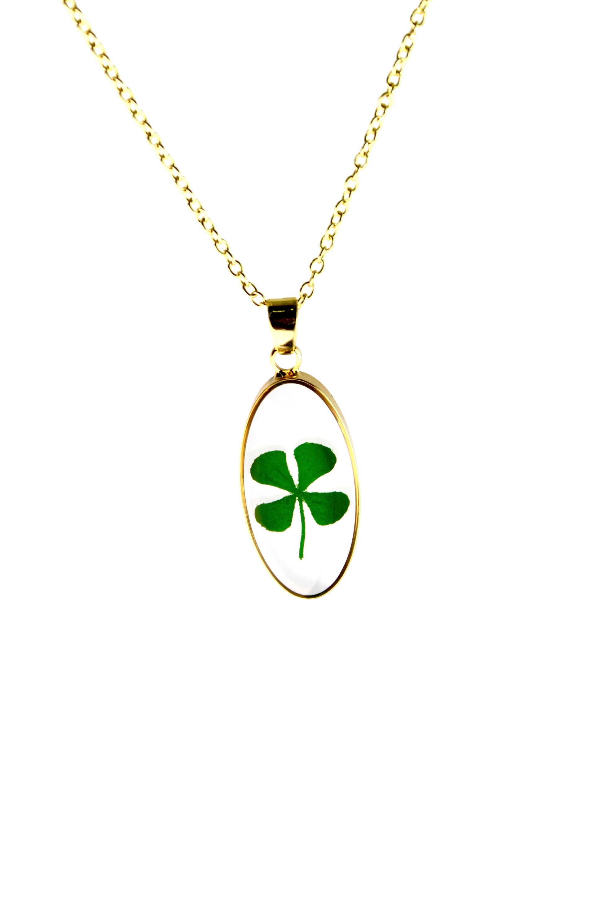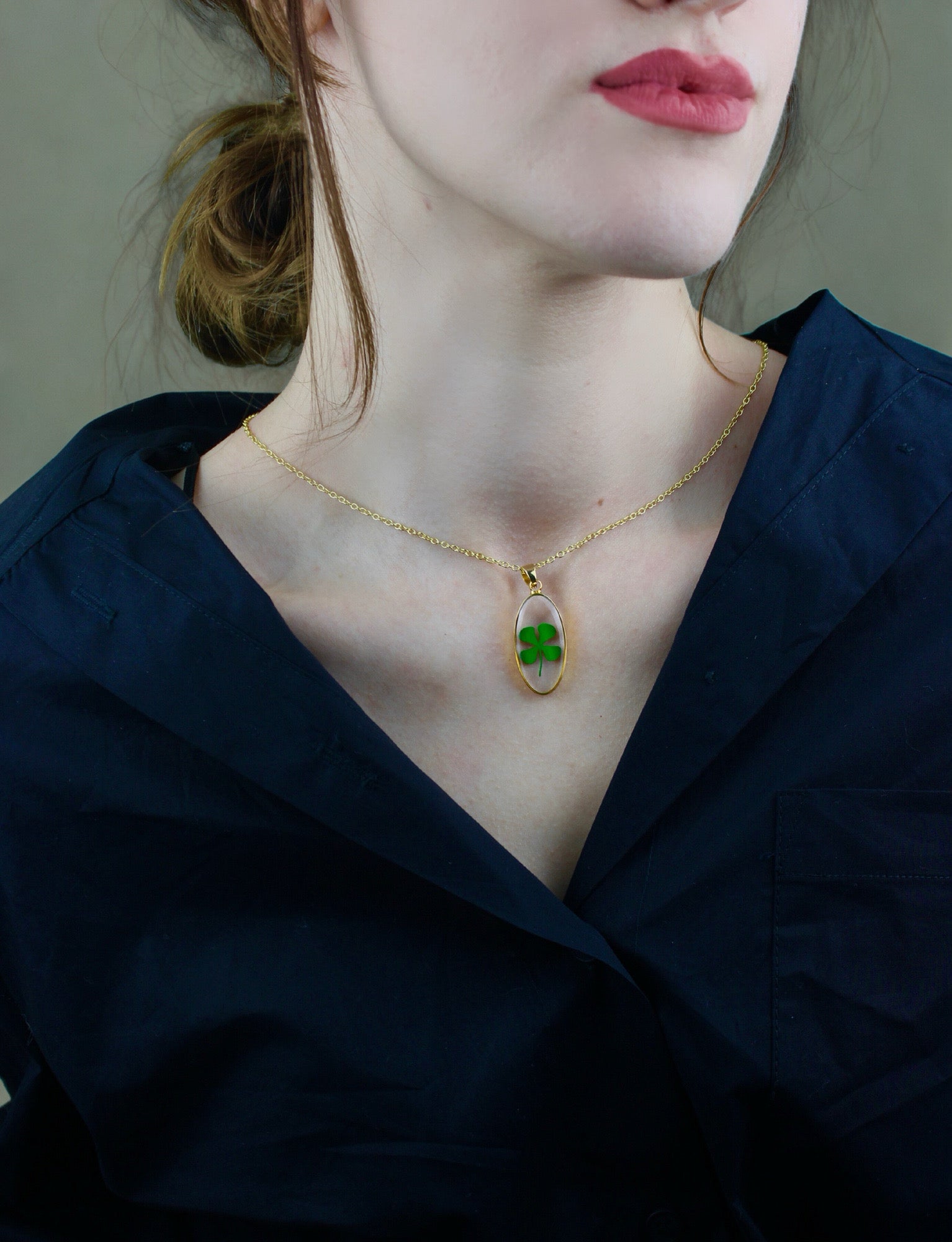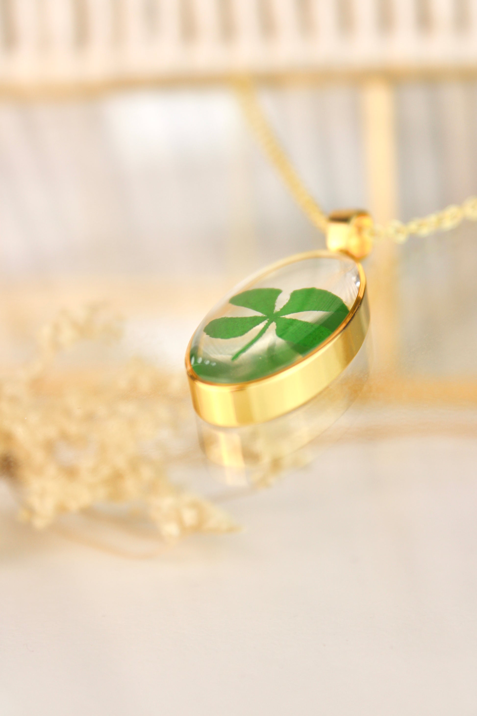 Een elegante ketting met een echte vierbladige klaver, zorgvuldig gedroogd en met de hand vereeuwigd in heldere resin.