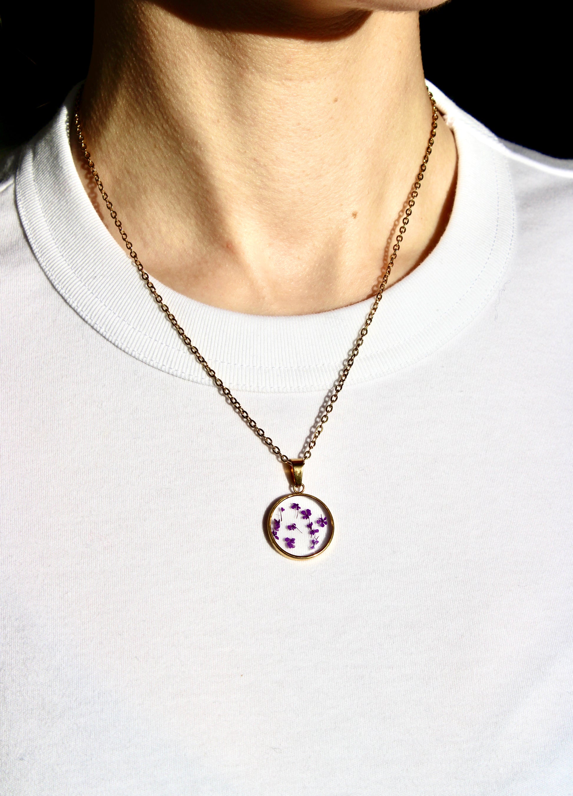 Echte, kleine paars bloemetjes worden zorgvuldig gedroogd en in een heldere basislaag bewaard; zo lijken ze uit de tijd gelicht en behouden ze voor altijd hun allereerste frisheid. De verfijnde goudkleurige ketting is minimalistisch en elegant, en past zowel bij dagelijkse outfits als bij speciale gelegenheden.